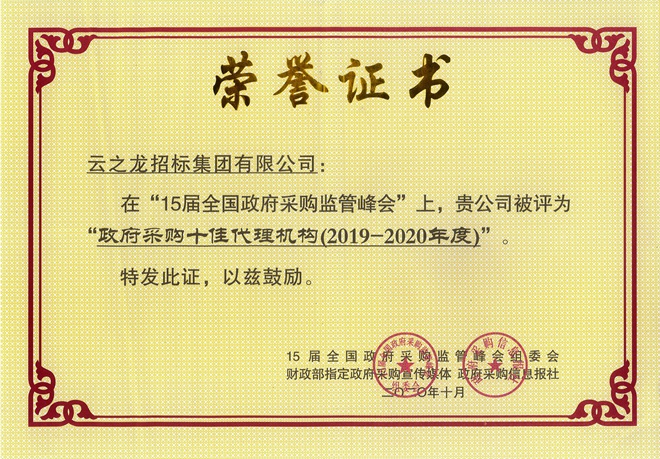 2020年10月22日,從第15屆全國政府采購監管峰會上獲悉,云之龍集團榮獲“全國政府采購十佳代理機構(2019-2020年度)”稱號。集團副總裁謝志紅、聶嘉薇參加峰會。