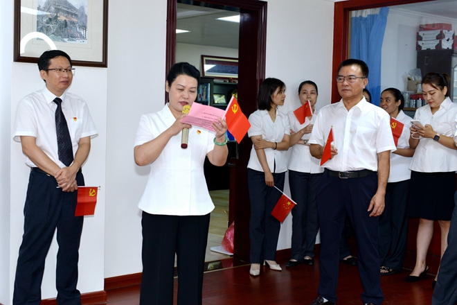 最后,全體黨員舉起右手,面對黨旗,莊嚴宣誓。鏗鏘恢宏的誓詞,強烈震撼著會議現場的的每一位黨員,一字一句,神圣而豪邁;錚錚誓言,體現了黨員同志們對中國共產黨的無限忠誠。