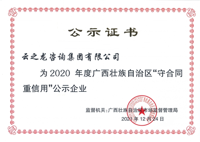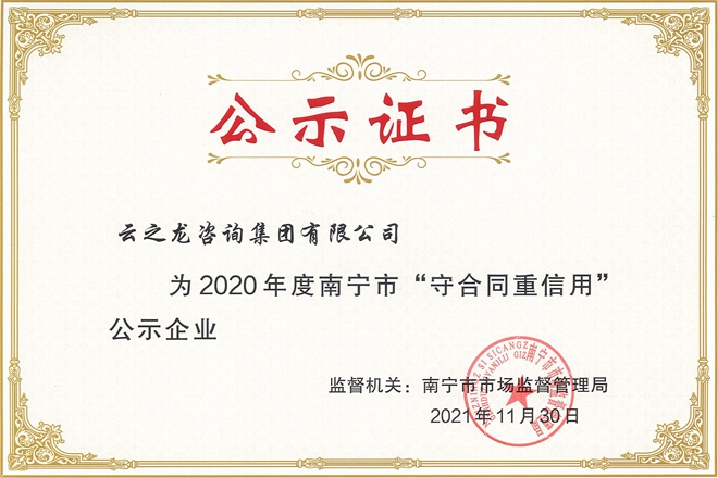 近日,從廣西壯族自治區市場監督管理局、南寧市市場監督管理局網站獲悉,云之龍咨詢集團喜獲“廣西壯族自治區守合同重信用企業”、“南寧市守合同重信用企業”兩項榮譽稱號。