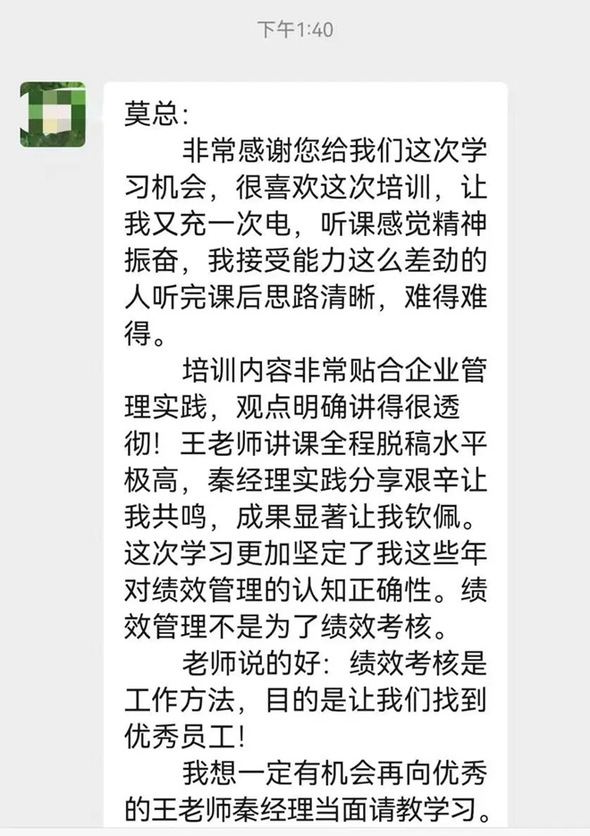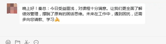 活動結束后,與會嘉賓紛紛表達分享會的感激之情。一位來自知名企業的中層管理人員表示:“王老師和秦總的分享非常實用,讓我對績效管理有了更深刻的理解。未來,也希望我們公司能有機會與王伯巖老師的團隊加強交流與合作,將績效管理更深入地運用到企業管理中,實現管理落地,推動企業向現代化、高質量發展。”