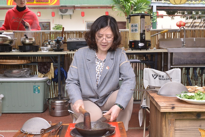 活動當天,黨員同志在社區(qū)工作者的帶領(lǐng)下學習非遺油茶的制作,先將茶葉輕輕翻炒,然后加入蔥、姜一起捶打,直至水分蒸發(fā),炒出香味,再加入熱水煮沸,最后過濾茶葉,一碗香噴噴的油茶就做好啦。