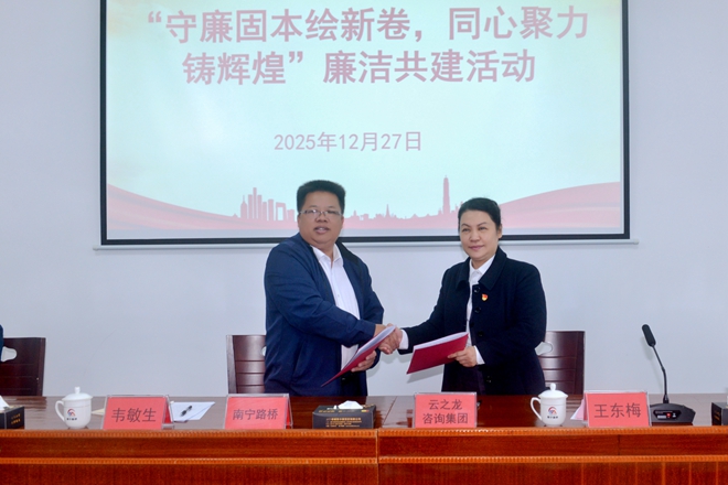 活動伊始,雙方舉行廉潔共建協(xié)議簽署儀式。南寧路橋黨支部書記、董事長韋敏生與云之龍黨總支部書記、集團總裁王東梅簽署《廉潔共建協(xié)議書》,標志著雙方共建關(guān)系邁入以“清”護航、以“廉”促行的新階段。