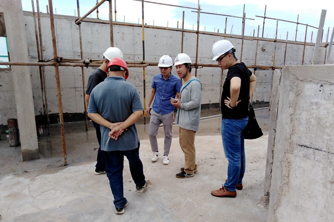 法國必維集團裝配式建筑專家與云之龍團隊共同探討了很多容易忽略的問題,如豎向預制構件應如何逐層消除累計誤差保證豎向構件安裝順利;豎向預制構件套筒灌漿施工過程中的注意事項;當有兩層管線穿行時不建議采用預制樓板的原因等。