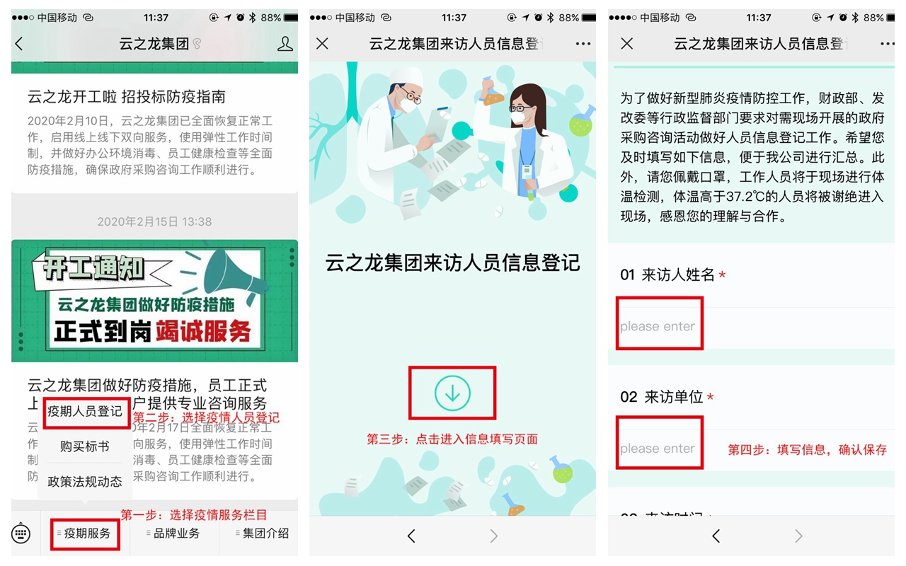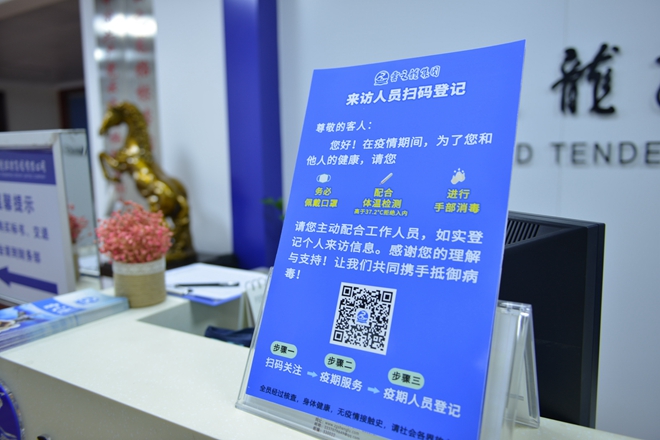 云之龍集團各個分公司都已按要求做好防疫工作。云之龍集團公眾號開通來訪線上登記功能,到達集團總部及各個分公司的客人都需及時做好信息登記。